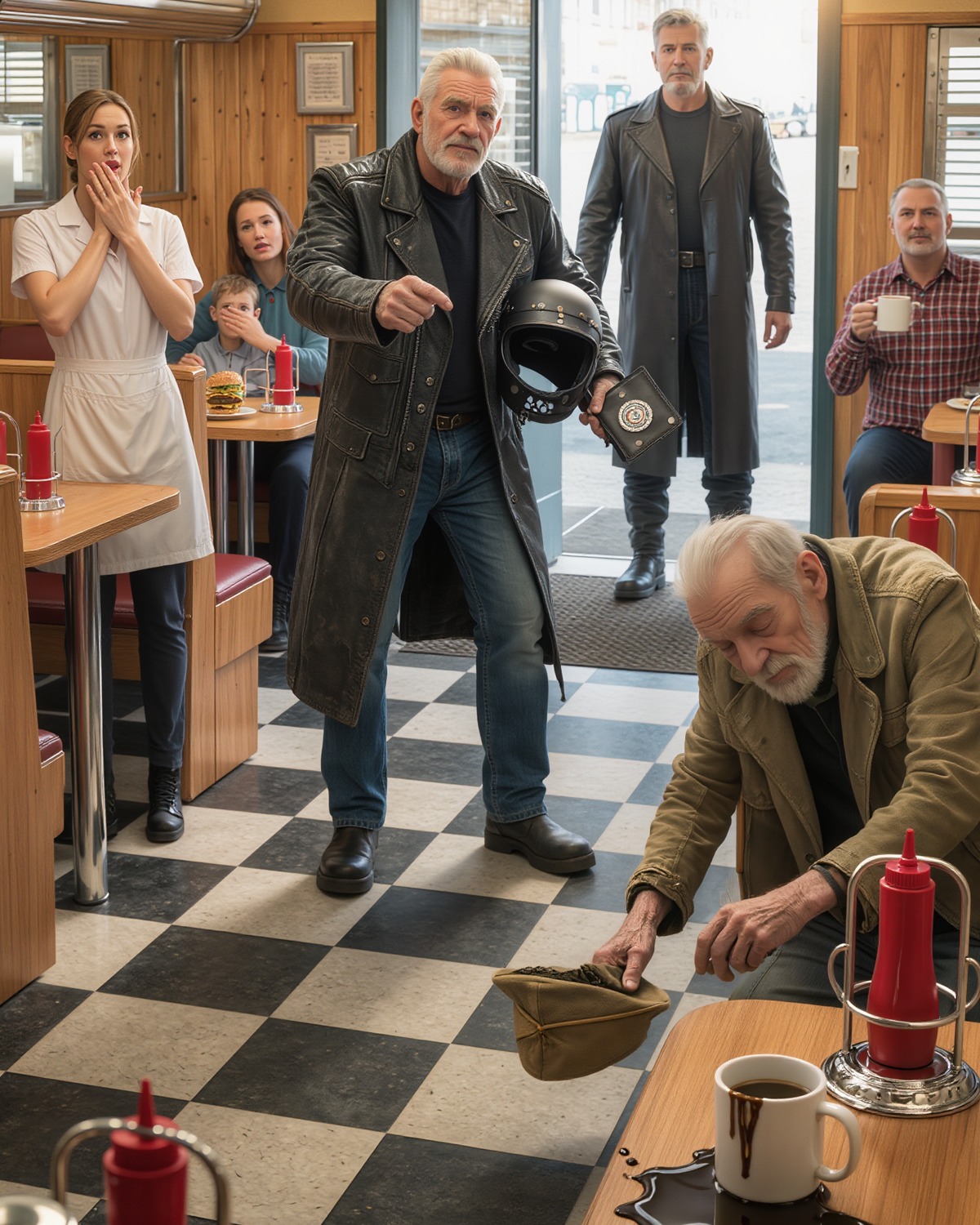 The silence shattered when the door slammed open. A biker stormed in, boots heavy on the floor. His eyes locked on the veteran.
