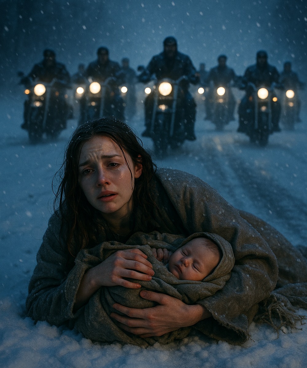 Just then, headlights cut through the storm. Ten motorcycles rolled to a stop — the Steel Ravens. Their leader, Cole Maddox, rushed to Lila’s side. Weak and fading, she begged, “Promise you’ll take care of her.” Cole nodded, holding the baby tight. Lila whispered the name Grace before taking her final breath. That night, a stranger’s promise became a destiny.