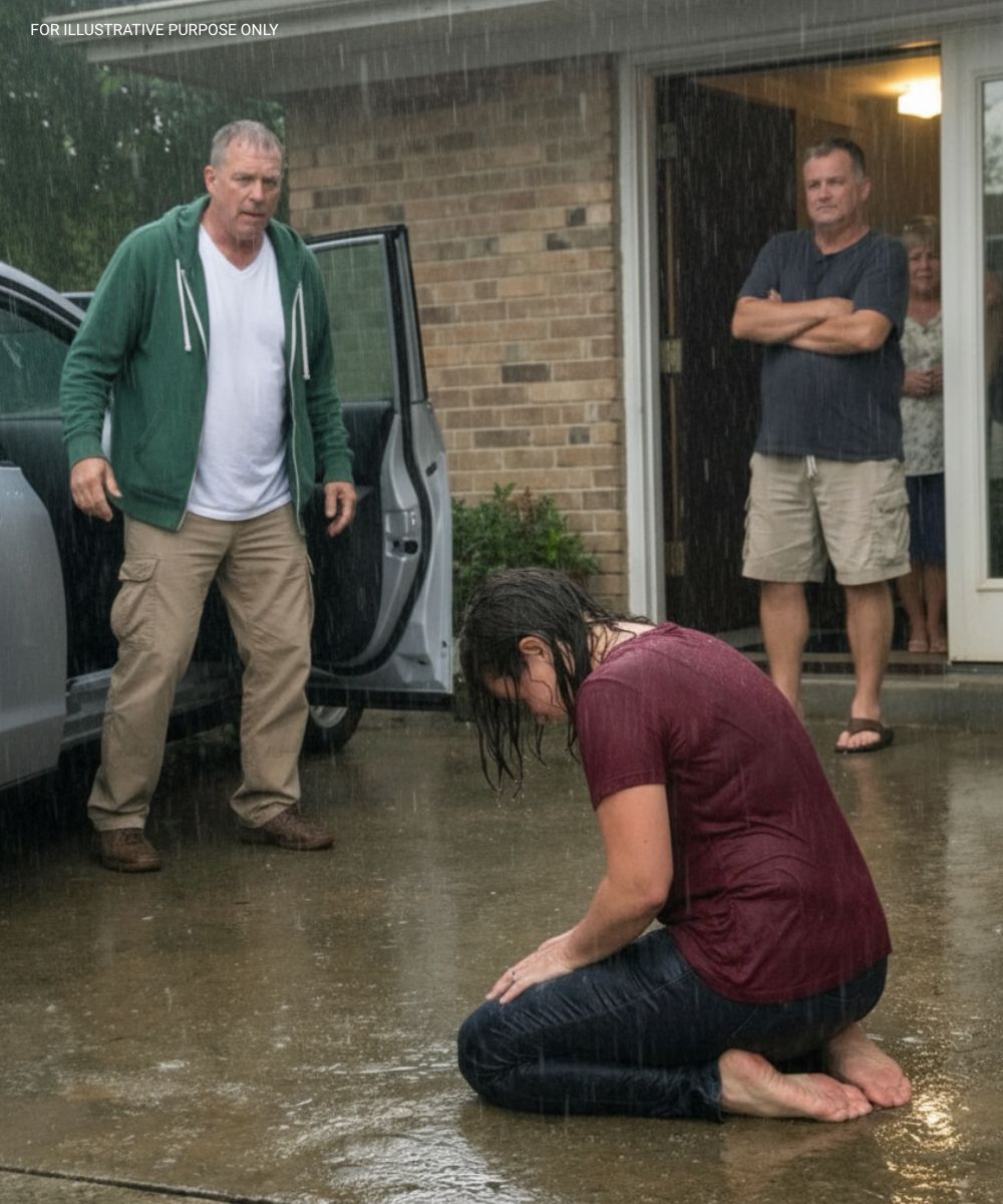 I never expected to find my daughter kneeling in the rain outside her own home. The storm had soaked everything, but nothing compared to the shock that froze me when I recognized her—head bowed, shoulders shaking, fear written across her face. Claire tried to send me away, whispering that she was “fine,” the same word she’d used her whole life to hide pain. When I wrapped her in my coat, she finally admitted the truth: her husband and his family had forced her outside as “discipline” for buying herself a dress. Laughter echoed from inside the house, turning cruelty into entertainment.