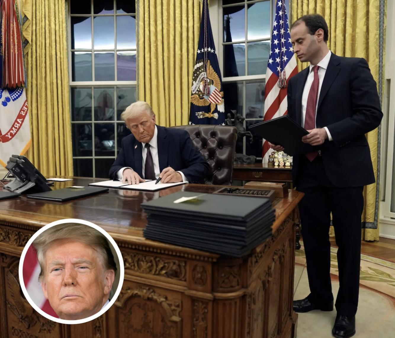 Biden’s blue rug has been replaced by Trump’s neutral-toned version, while new additions, including silver eagle ornaments and a gold “Trump” paperweight, complete the space.