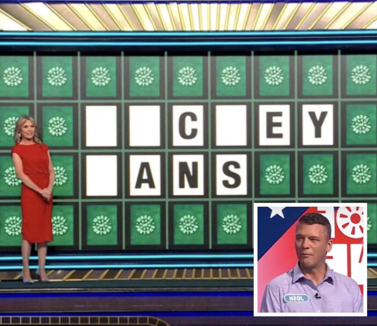 With his Wild Card and the highest score, Post chose the category “People.” After revealing the standard letters plus his chosen “C, D, M, A, and Y,” the final puzzle appeared as “_ _ C E Y _ A N S.” As the clock ran down, he guessed “Juicy Fans,” leaving viewers stunned. Host Ryan Seacrest joked, “Some of the best fans are juicy,” before revealing the correct phrase: “Hockey Fans.” The missed solve cost him a heartbreaking $45,000.