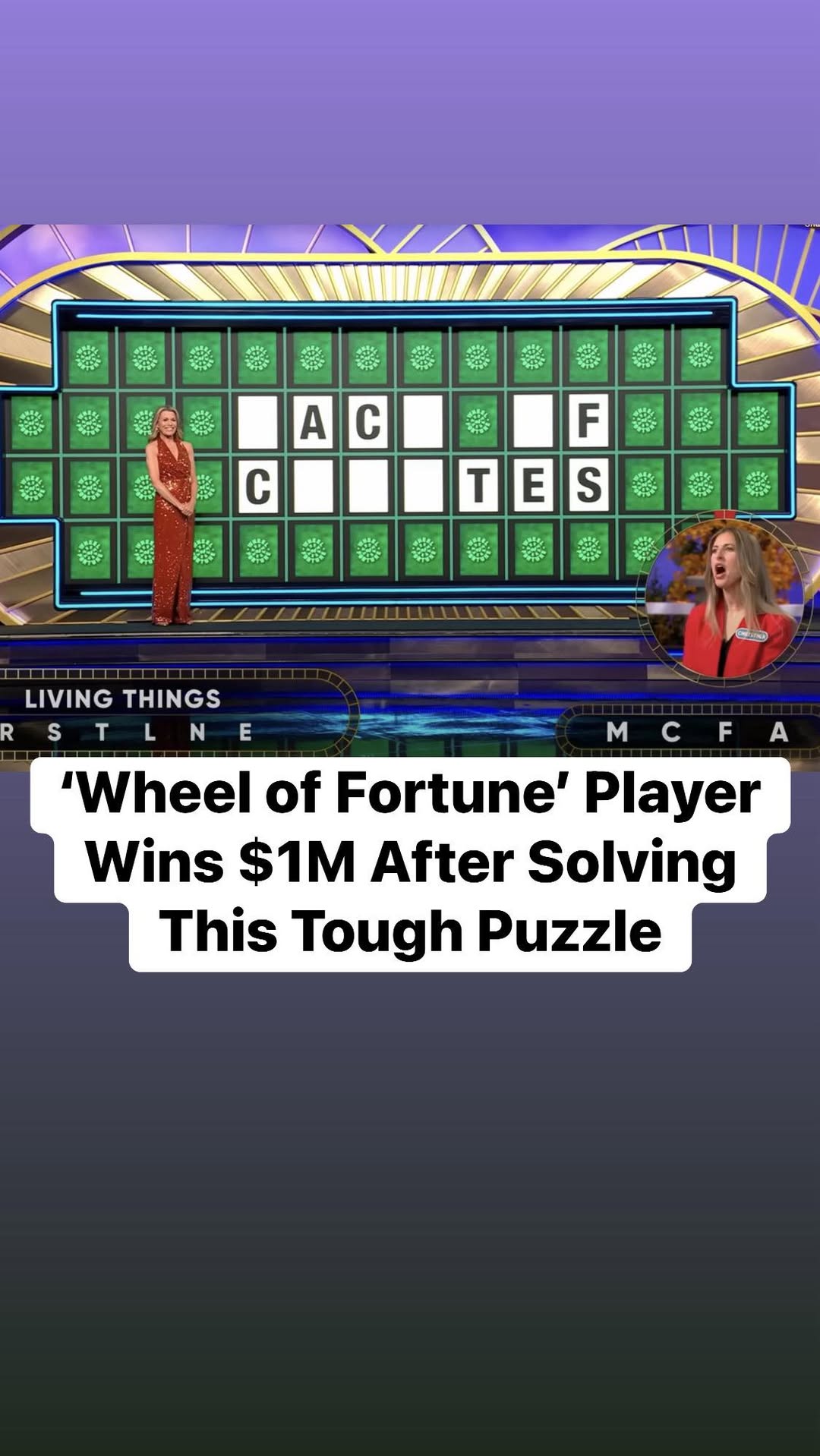 The bonus puzzle’s category was “Living Things.” After selecting the letters M, C, F, and A, the board revealed just enough clues. As host Ryan Seacrest began the countdown, Derevjanik confidently answered, “Pack of coyotes.” In seconds, she realized she’d solved it — and when Seacrest opened the envelope to reveal the $1 million jackpot, she burst into tears as confetti filled the studio.